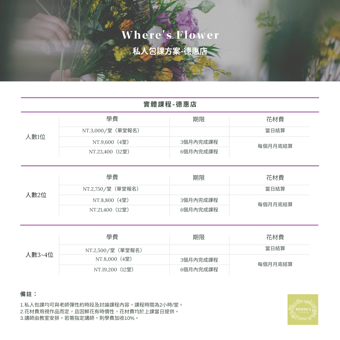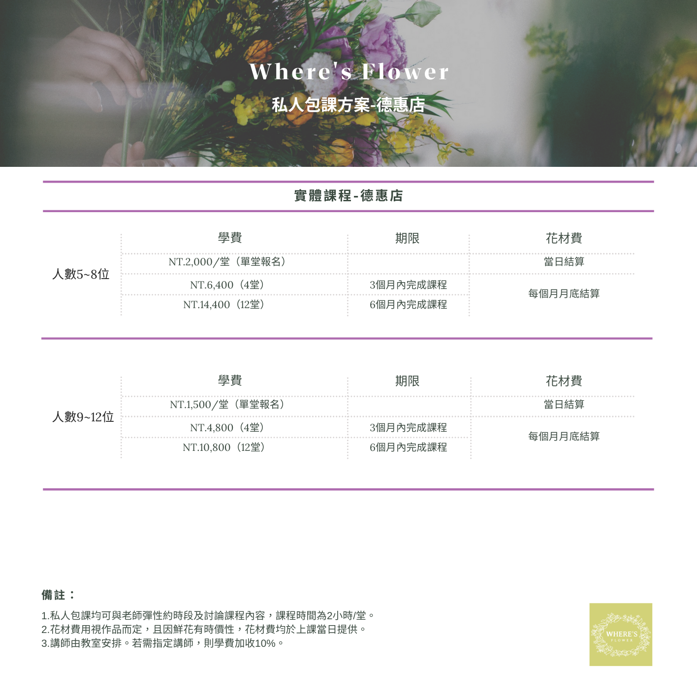 Where’s Flower 提供客製化私人包班花藝課程,可依人數、時間、預算與想要學習的內容設計專屬的課程,並可選擇來德惠教室上實體課程或利用免費線上軟體做遠距教學,歡迎企業團體、親朋好友包班預約,與 Where’s Flower 一起進行一場花藝約會!
